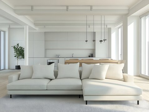 Bright and airy open concept living space with a spacious L shaped sectional sofa and a sleek minimalist aesthetic  The neutral textiles and natural light create a serene calming atmosphere