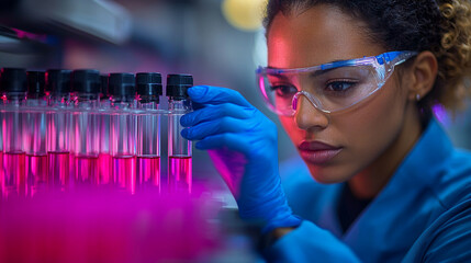 scientist in lab coat analyzes samples in test tubes, showcasing focus and precision. vibrant colors enhance atmosphere of scientific exploration
