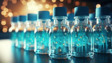 Glowing DNA strands in laboratory glassware create futuristic and scientific atmosphere