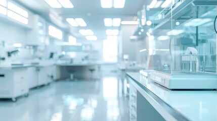 Blurred modern laboratory room with scientific background in white and light blue tones