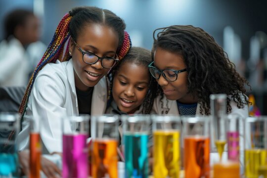 Group of passionate young students engaged in a fun, educational science project at their school laboratory. Animated kids brainstorming and tinkering with science experiments in class. Stem education