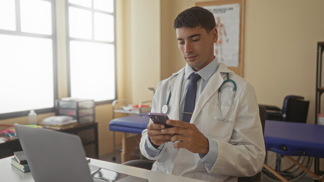 Hispanic man doctor wearing lab coat and stethoscope holds smartphone and taps screen in hospital building; concentration.