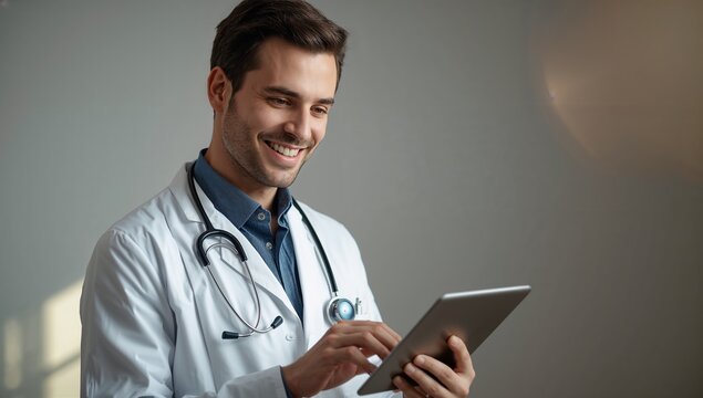 Man doctor wearing lab coat with stethoscope smiling while tapping smartphone in restaurant; happiness.