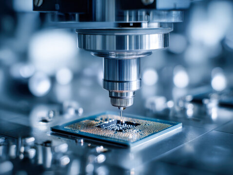 Close-up of a high-precision manufacturing process involving a microscopic chip under an advanced industrial machine in a modern electronics lab setting