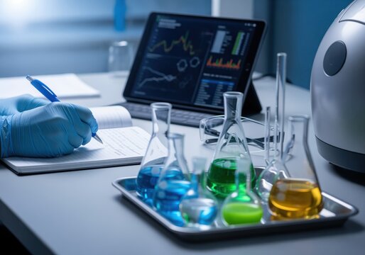 Close-up of a lab notebook with detailed sketches and notes, a pen resting on the page, surrounded by basic lab equipment like test tubes and a pipette,