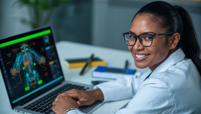 Researcher analyzing holographic globe projected above laptop in modern lab workspace