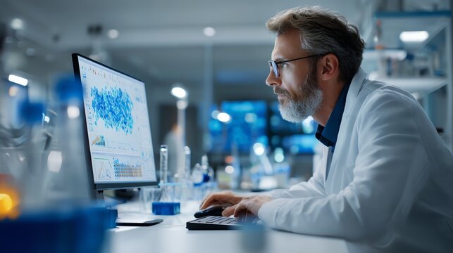 Researcher analyzing neural network diagnostics and biomedical data on lab monitor