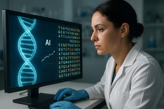 A scientist intently analyzing genetic data on a computer screen.