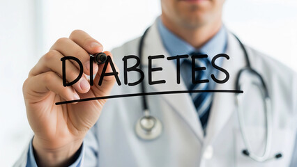 A male doctor or researcher with a stethoscope and lab coat writes the word "DIABETES" with a pen on a transparent board. A visual for medical, healthcare, and disease-related themes.