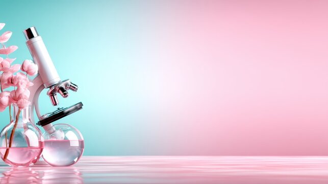 Biochemistry and Science in Nature: A fresh young plant stands beside scientific flasks and bubbling water, a visual metaphor for nature and scientific exploration.