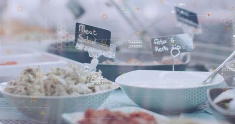 A bottle of olive oil sits on a table next to a jar of sunflower seeds. The image is a collage of different shapes and colors, giving it a unique and artistic feel. The combination of the bottle