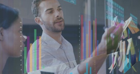 Pointing light-shirted man touching glass wall at office, dark-clad woman viewing charts and notes