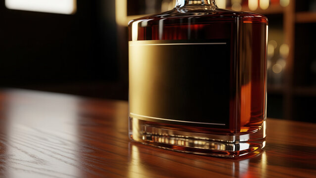Elegant non-alcoholic spirit bottle with a '0%' label on a wooden bar counter. Concept of healthy lifestyle and moderation