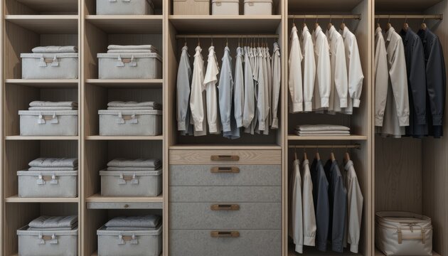 Organized wooden closet with shelves, drawers, hanging white shirts, and labeled storage boxes in a tidy wardrobe interior.