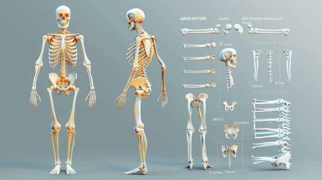 Anatomical illustration of the human skeleton in a standing position with labels on major bones