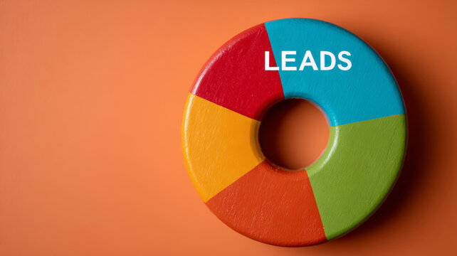 Colorful pie chart labeled 'Leads' on orange background.