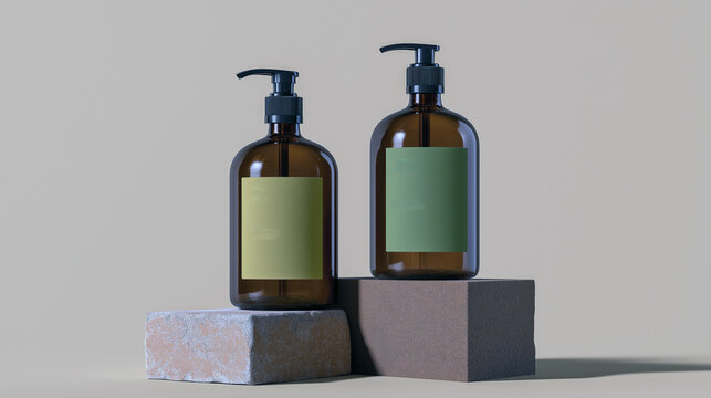 Amber glass bottle pump dispenser container black label cosmetic beauty skincare product mockup packaging minimalist clean elegant modern still life studio shot neutral background podium display