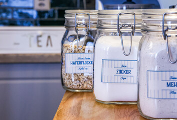 Kitchen jars with labeled pantry staples on a wooden shelf