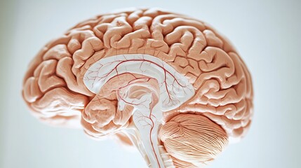 A close-up view of a human brain with labeled anatomical parts, placed on a sleek black background for a clean, educational representation of its features.
