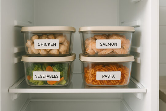 Organized meal prep with labeled containers of chicken, salmon, vegetables, and pasta