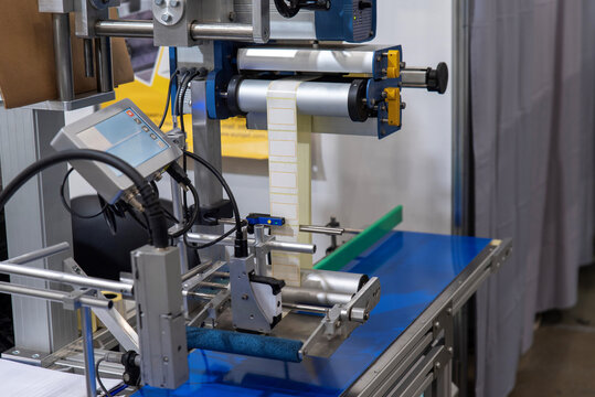 Automatic labeling machine during operation. Factory for the production of vegetable oil.