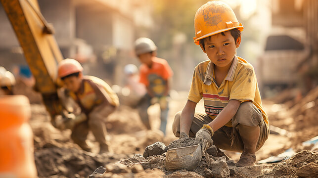 Children are forced to work in construction areas. Human rights concepts, December 10 Stop child abuse, violence, fear of child labor and human trafficking.