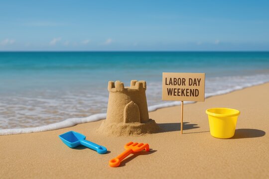 Beach scene with Happy Labor Day sign written sand. Coastal view of ocean, with colorful beach toys and umbrellas. Labor day holiday celebrating summer fun, leisure, vacation with friends family.