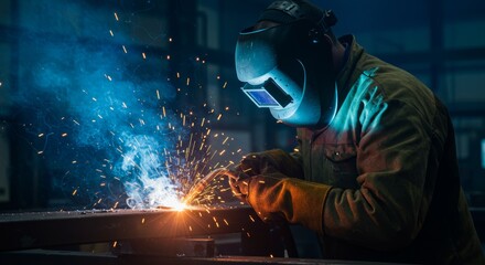 Welder working with intense focus in industrial environment