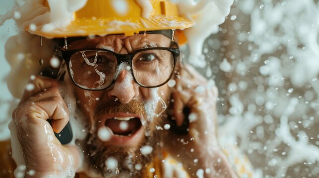 A person, wearing a helmet, is washing off suds and appears to be in an industrial setting. Suds and water droplets are seen all over the image.
