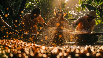 Harvest season  laborers meticulously picking coffee beans in sieve during the busy harvest period