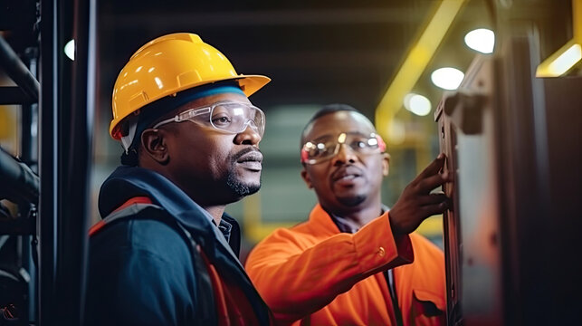 Teamwork African American worker in the factory.Black man afro work heavy industrial