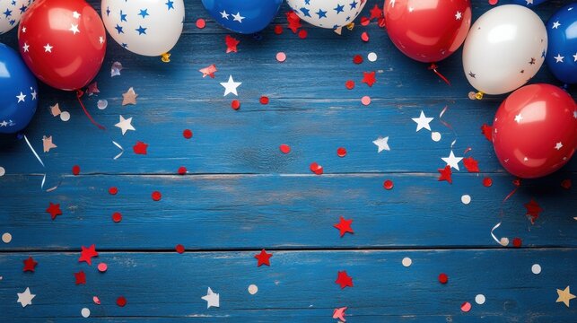 a patriotic Labor Day background with red, white, and blue balloons, confetti, and stars scattered over wooden planks