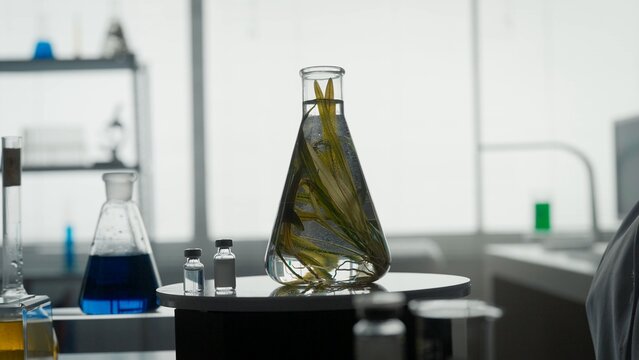 Laboratory research with scientific flasks and researchers in background