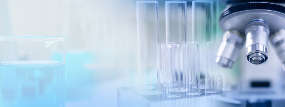 Science laboratory background, wallpaper or banner. Concept of biotechnology, chemist, glassware, discovery and experiment background. Biology and microscope banner. Scientist wallpaper.