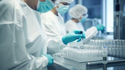 Medical team meeting analyzing blood test results in hospital laboratory. Doctors and scientists in lab coats are having a discussion about blood test result, holding test tubes and taking notes.