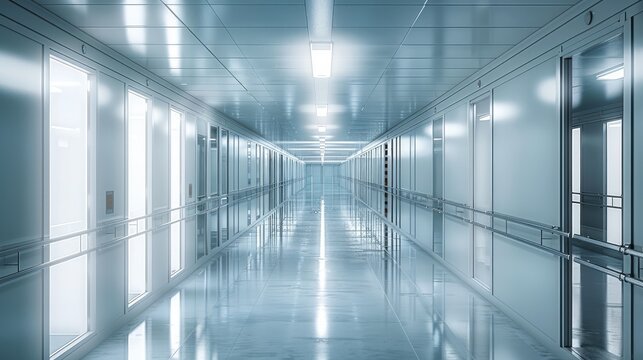 Long hospital bright corridor with rooms