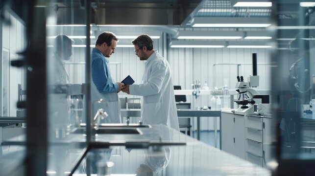 Scientists discussing data in modern laboratory