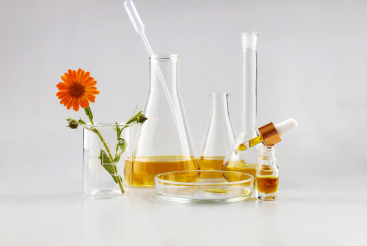 bottle with a pipette, laboratory flasks and calendula flowers on a gray background