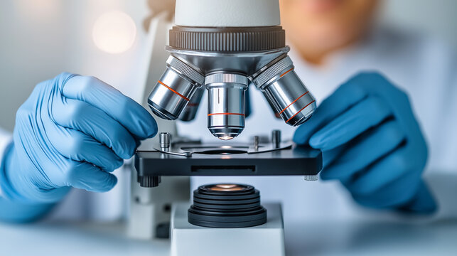 Laboratory technician examining a sample under a microscope in a modern lab setting