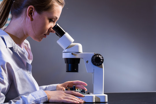 Young computer technician examining a printed circuit board. Microchip production factory.