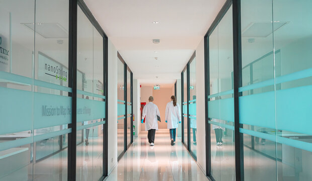 Medical laboratory technicians working with modern equipment performing blood analysis