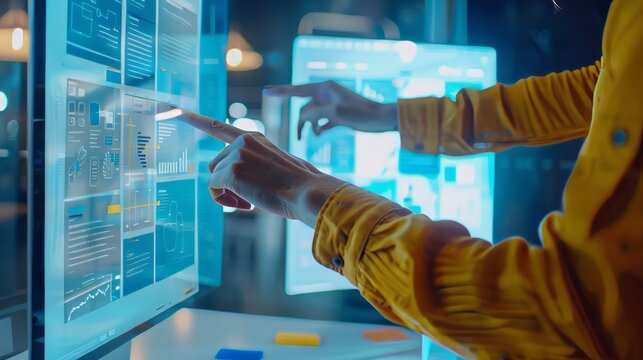 Woman tapping tablet with ui overlays showing analytics dashboard and team collaboration