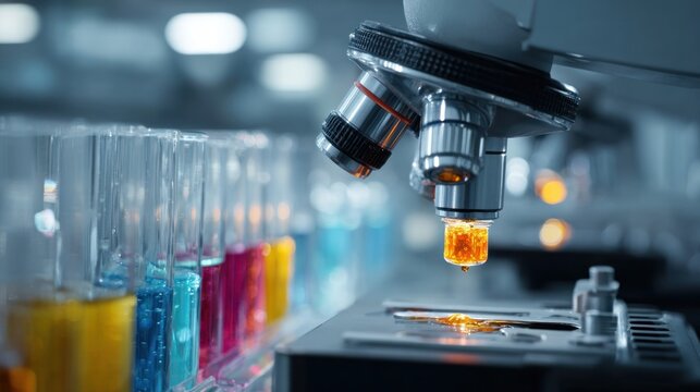 Stunning photo of Laboratory bench with test tubes and flasks filled with yellow liquid