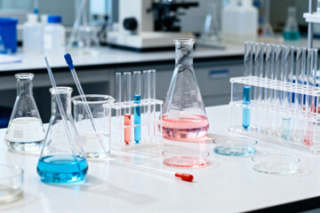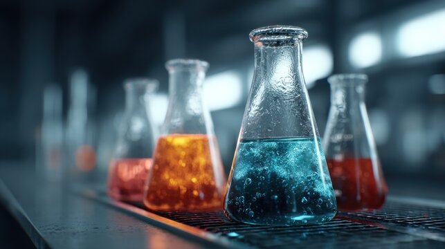 Laboratory Equipment with Colorful Liquids in Glass Conical Flasks Science