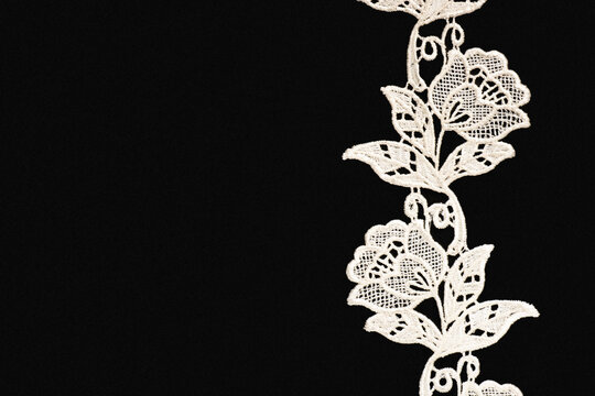 White lace with flowers and leaves on black background isolated vertically with copy space