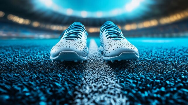 Two white shoes on a field, with the field being blue. The shoes are positioned on a white line, which is also blue. Scene is calm and serene, with the blue
