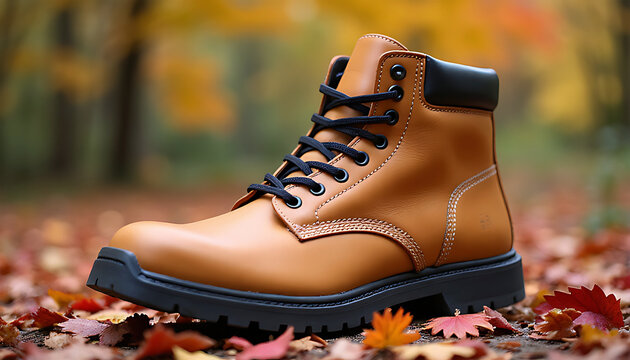 Stylish tan leather work boot with black laces in autumn leaves