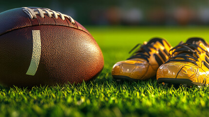American football and gold cleats on lush grass field. Concept of sports equipment and game preparation.