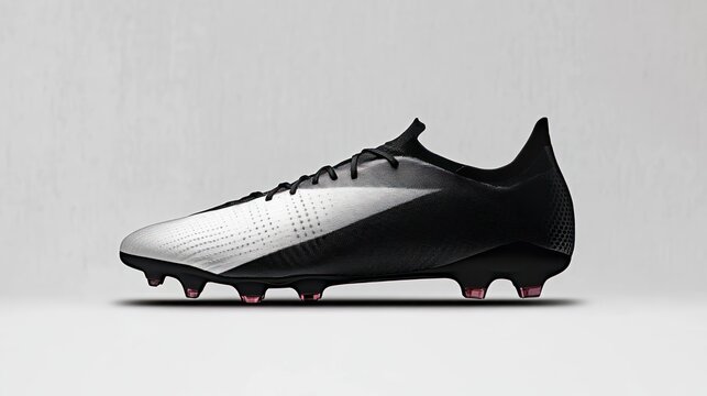 sleek black and white soccer cleat with textured synthetic upper, low-cut collar, laces and pink-tipped molded studs on a neutral background conveying dynamic confident mood