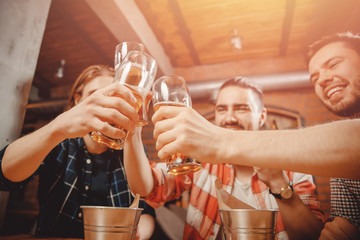 Three happy cheerful friends relaxing drinking beer at bar . Focus on clinking glasses. Concept of weekend, men friendship